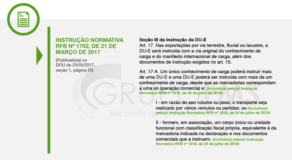 “Art. 17. Nas exportações por via terrestre, fluvial ou lacustre, a DU-E será instruída com a via original do conhecimento de carga e do manifesto internacional de carga, além dos documentos de instrução exigidos no art. 15.”